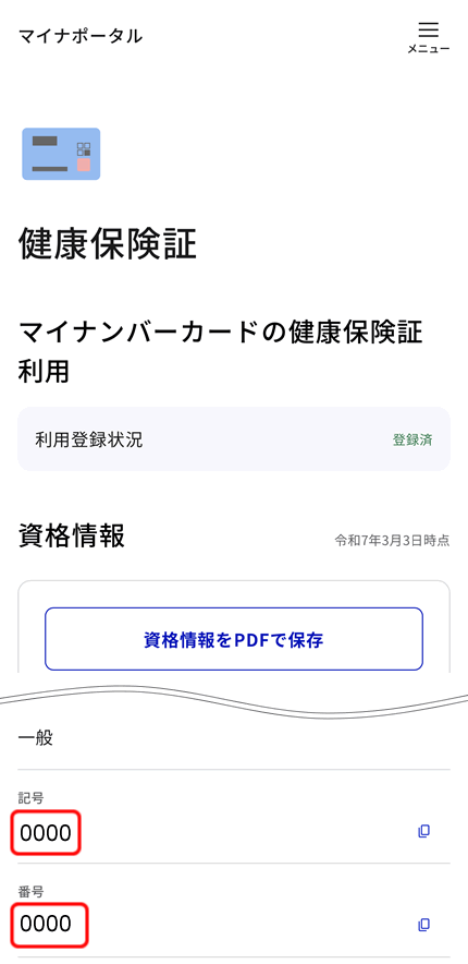 ②健康保険証の資格情報が表示されるので、画面をスクロールして資格情報を確認してください