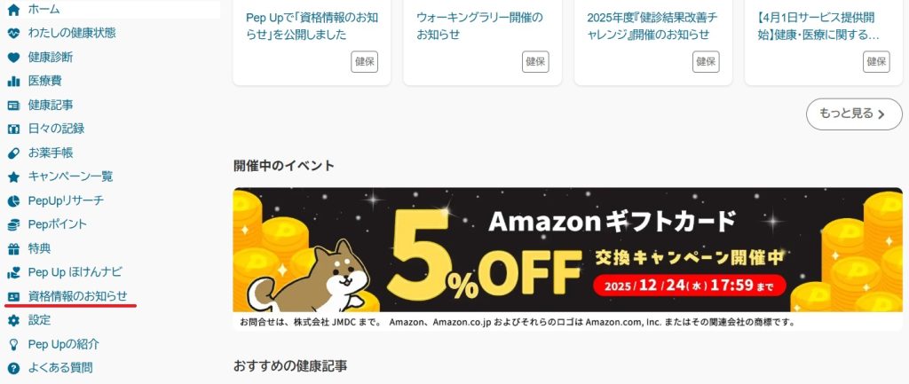 PepUpにログインして、画面左のメニューにある「資格情報のお知らせ」をクリック